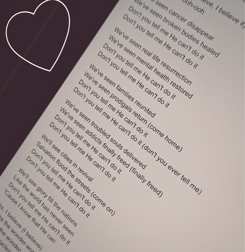 I absolutely love this song! The words are so true and that one line though! The one that says “don’t you tell me He can’t do it because I KNOW that He can!!!”. Man that speaks!!
